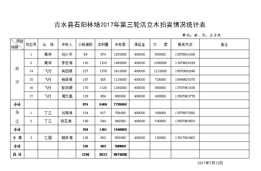 | 石阳林场2017年第三轮活立木拍卖情况统计表 |